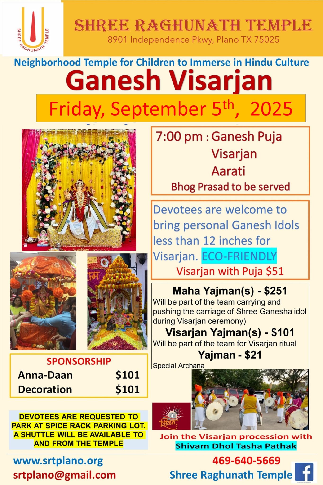 To assist the temple to continue organizing such unique events, Interested devotees can donate towards Ganesh idol and celebration.